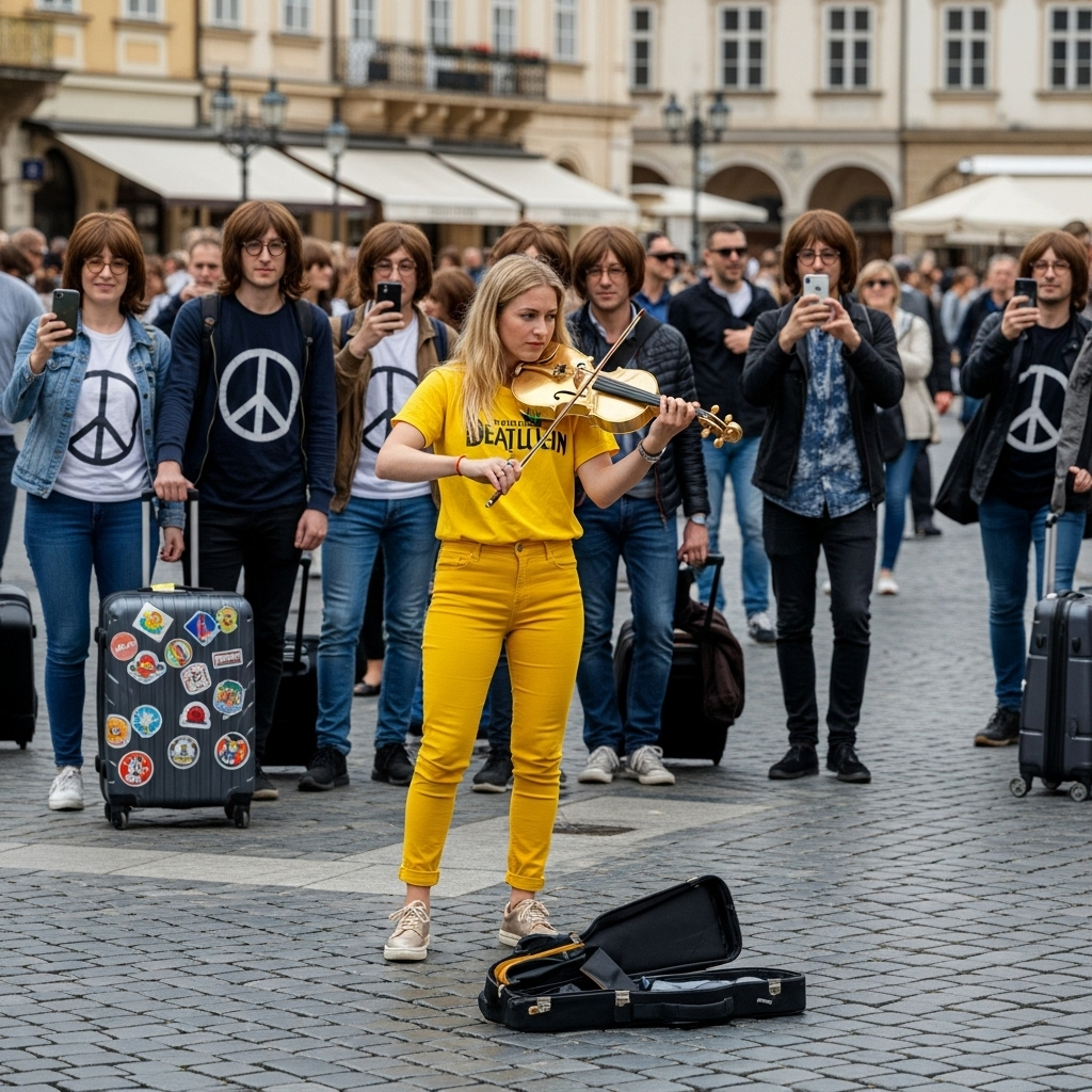 Hasta mí llega la melodía siempre naciente de la partita número 2 en re menor de Bach. La veo tocar, frágil y etérea, engullida por una multitud de turistas disfrazados de John Lennon, con olor a ajo, a alcohol y al desecho de hot dogs a medio pudrir.