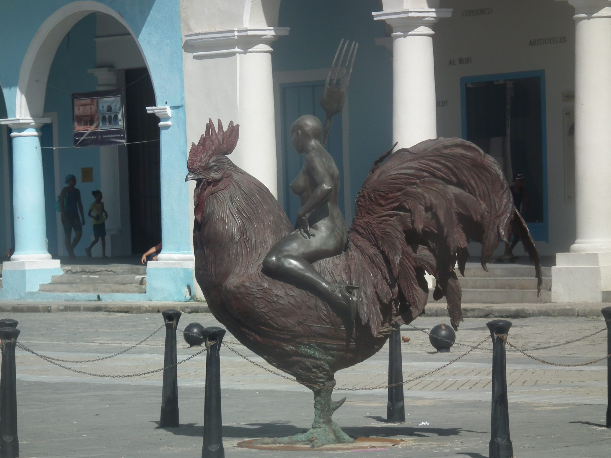 La jinetera impresionaba: completamente calva, desnuda, espoleando al gallo con sus tacones de aguja, sostenía en su mano derecha un tenedor gigantesco apoyado en el hombro. No era solo una mujer, era la alegoría viva de La Habana: fiera, sensual, indomable. Sobre el gallo —símbolo de hombría— se erguía victoriosa, como si recordara a todos que el poder femenino puede domar cualquier fuerza.